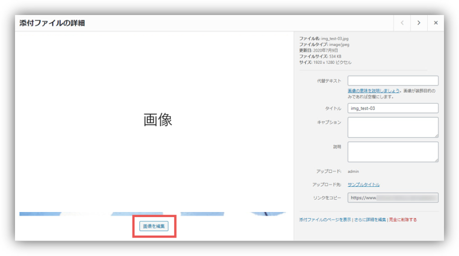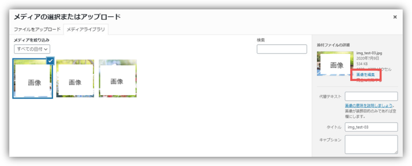 1. メディアライブラリから編集したい画像を選択し、表示された赤枠「画像を編集」ボタンを選択します。