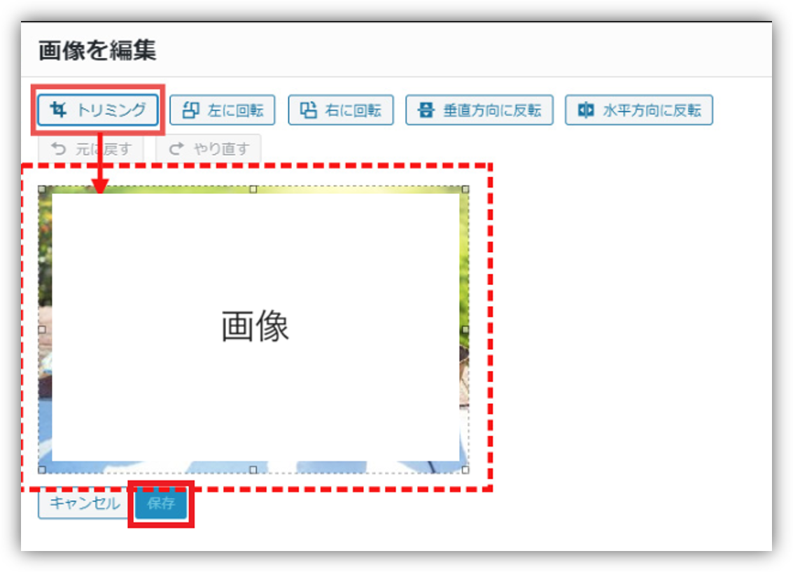 1. 画像編集画面から赤枠「トリミング」ボタンを選択します。→画像が点線で困れます。