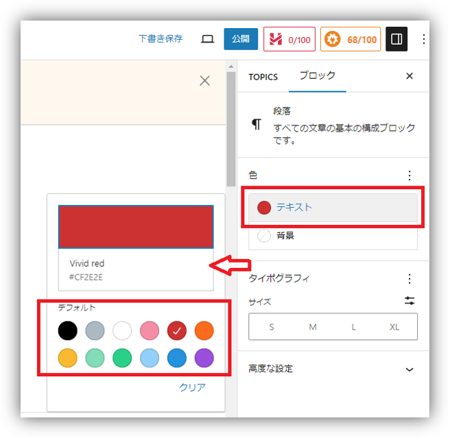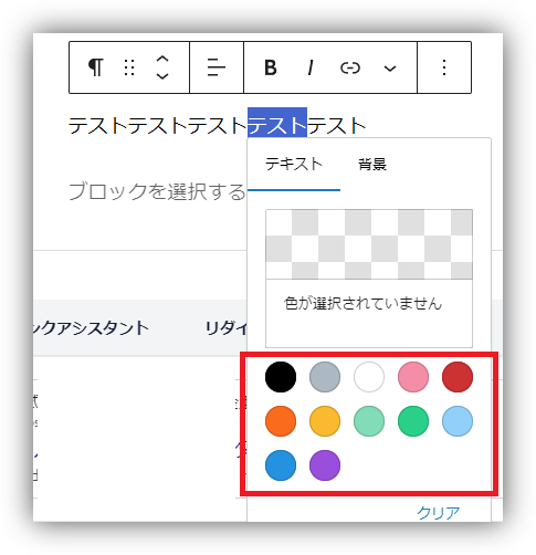 画面右に表示されているブロックタブの「色」→「テキスト」を選択し、変更したい色を選択します。 -