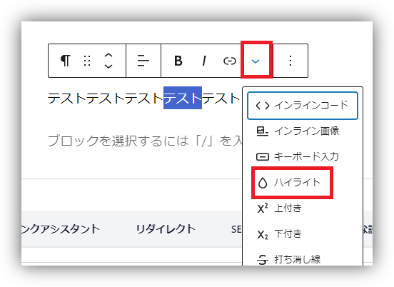 赤枠「V」をせんたくし、「ハイライト」を選択します。